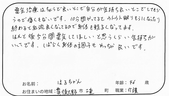電気治療はちょうど良いところで自分が気持ち良いところでしてもらうので、痛くもないです。